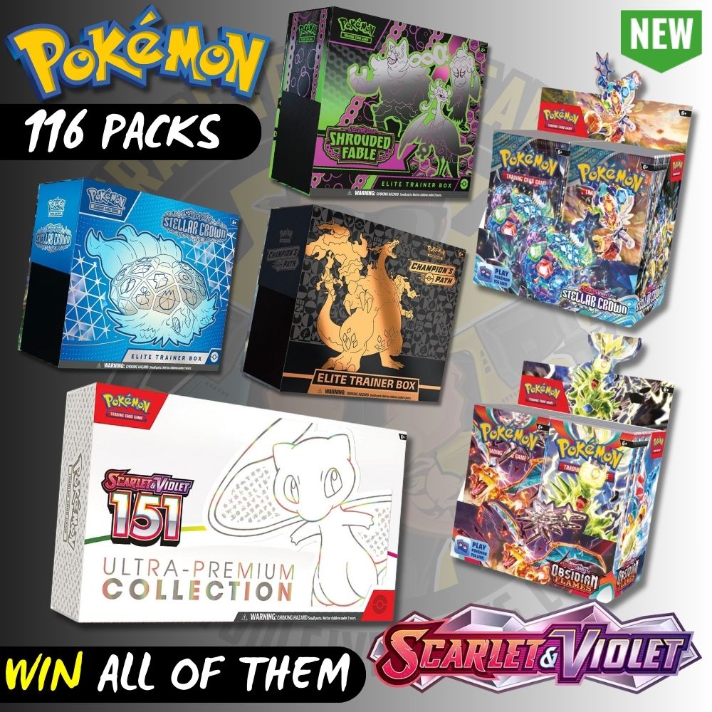 Contents: 9x booster packs (each pack containing 10 cards), 65x card sleeves, 1x foil promo card, 45x Energy cards, 6x damage-counter dice, 1x competition-legal coin-flip die, 2x condition markers, 1x collector’s box & 1x guide