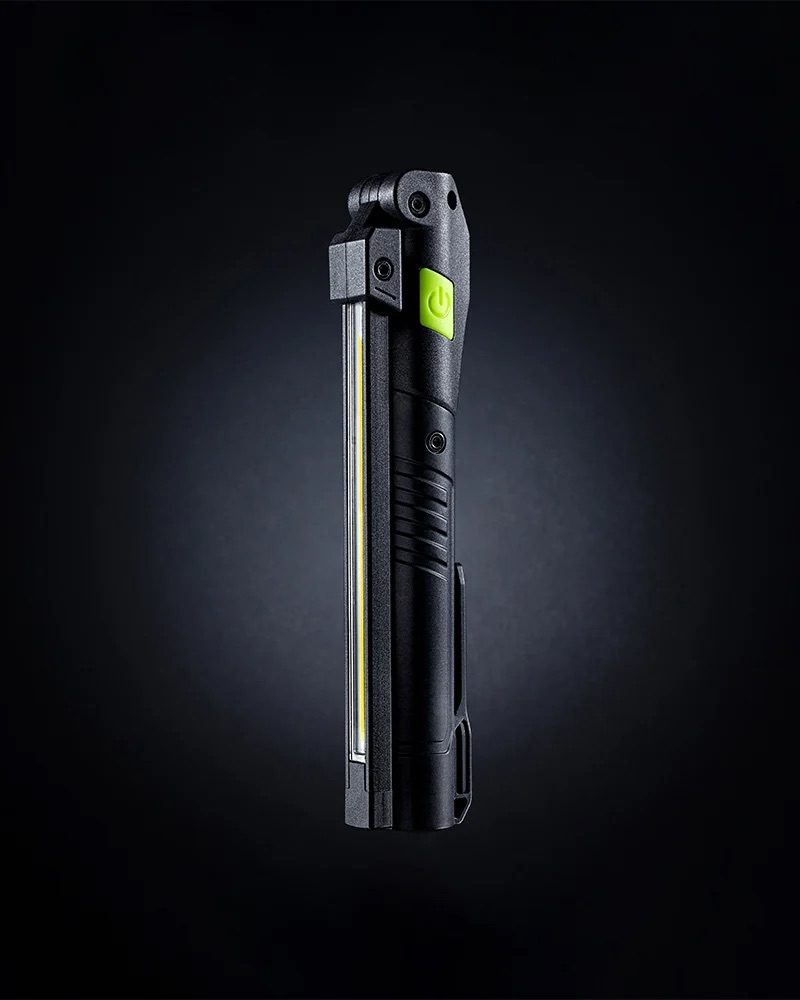 The IL-375R is a high quality 180° folding inspection light. It has 3 independent lights, with two main COB LEDs and an additional SMD LED top torch. Ultra compact in design, it has a super tough IK07 copolymer and aluminium construction. There are strong magnets in the base and rear, as well as a useful pocket clip. Its rechargeable lithium battery can be recharged in 3 hours.