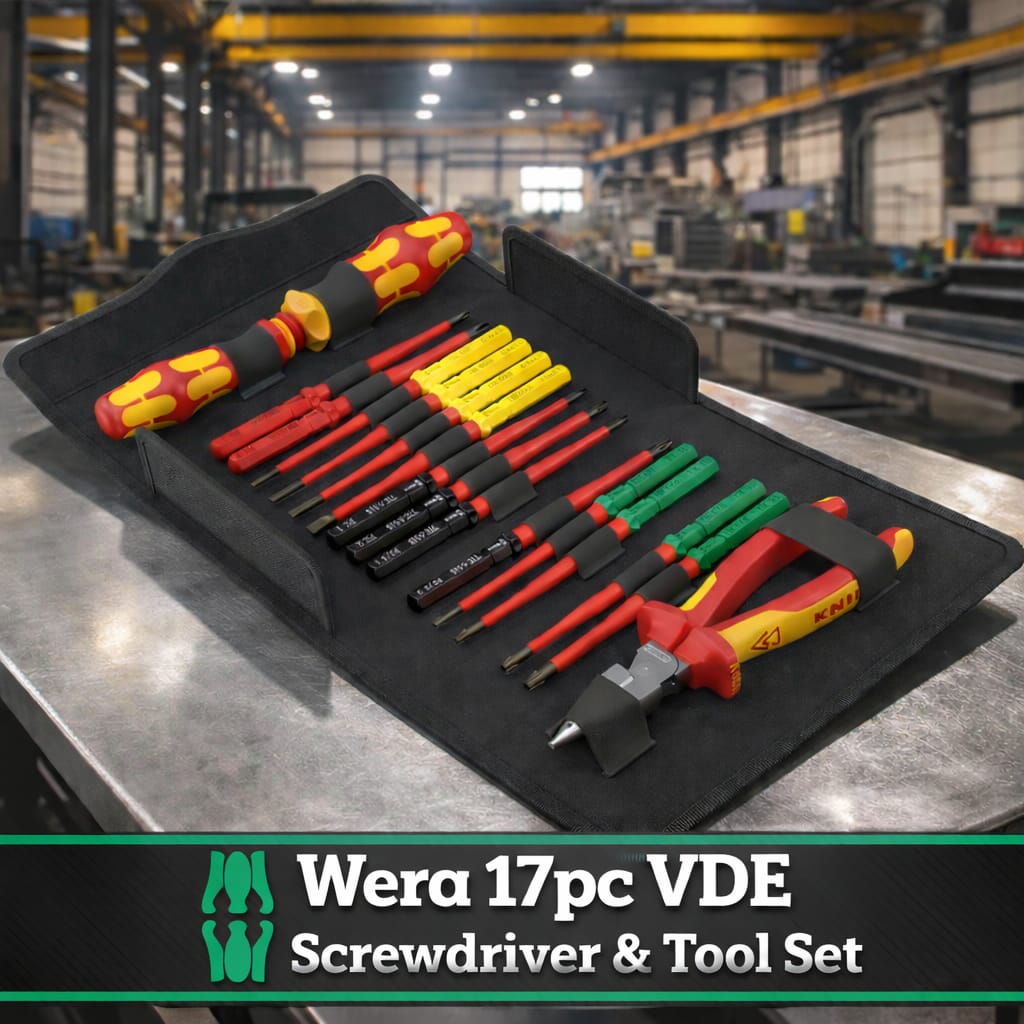 The Wera 17 Piece Kraftform Kompakt VDE Extra Slim Screwdriver & Tool Set is a premium 17-piece tool set crafted for safe, efficient electrical work up to 1,000 volts.