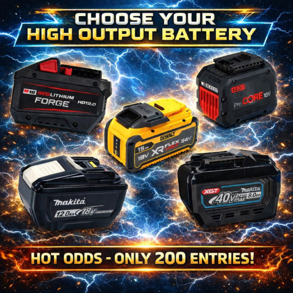 This competition is open to UK residents aged 18 or over. You may enter this competition up to 40 times. You will be randomly allocated ticket number(s) when ordering and will receive an email confirmation. The total amount of tickets for this competition is (420). If all tickets do not sell out, the draw will happen on March 6, 2026 regardless. You must answer the competition question correctly to be entered into the live draw. Incorrect entries will not be notified or entered into the live draw. You may enter the competition online, or for free by post by sending your entry to Trade Tool Giveaways on a postcard. You must have an account on Trade Tool Giveaways for your entry to be processed. All details on your entry MUST correspond to the details on your account to receive the order confirmation and ticket number. Postal entries received without a registered account cannot be processed. The live draw will take place on Trade Tool Giveaways Facebook page using Google’s random number generator to select the winning ticket number from all Entrants. This competition is in no way sponsored, endorsed, administered by or associated with Facebook, Apple or Google. By entering the competitions, Entrants agree that neither Facebook, Apple nor Google have any liability and are not responsible for the administration or promotion of this competition.