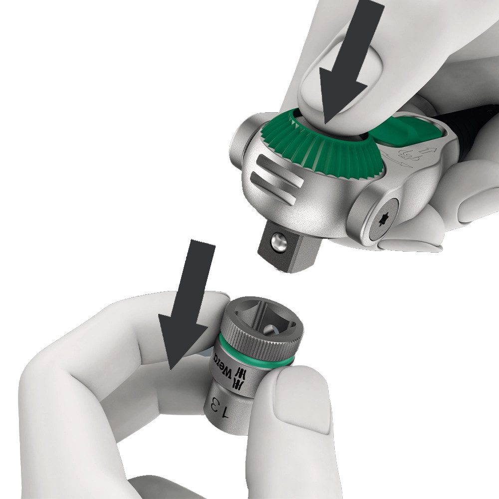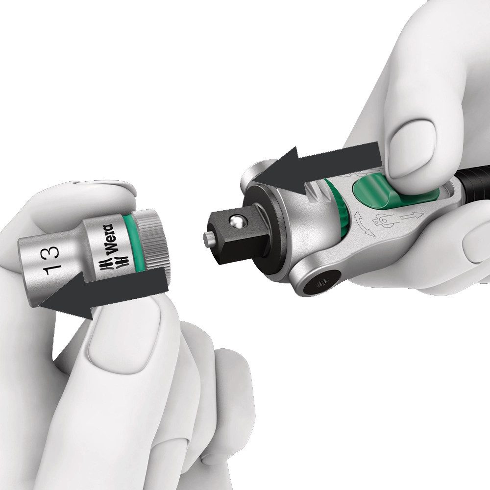 Unique production quality sockets for hand or power use (non-impact). Wera’s flexible lock system is fitted in premium extensions for tool security. Kraftform handle is ergonomic to provide comfort during intensive use and high torque transfer.