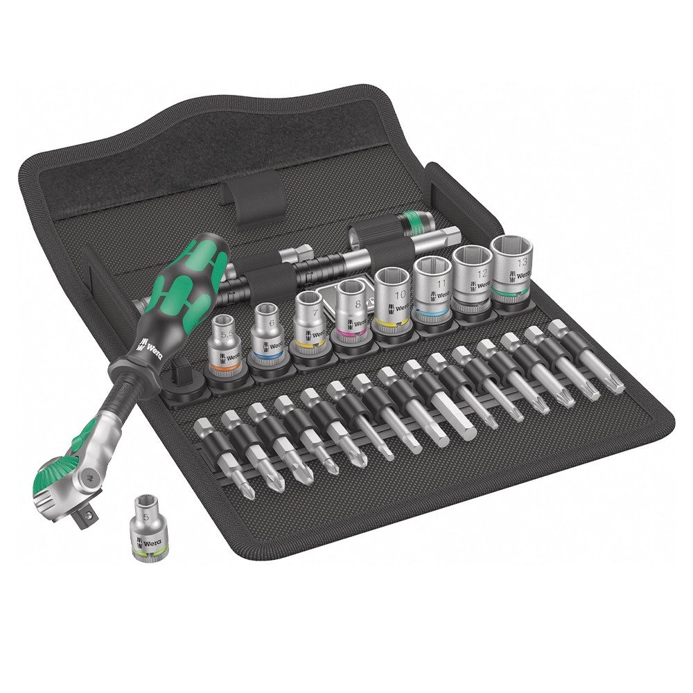 Zyklop SA 6 28 Piece Speed Ratchet Set 1/4″ Drive, combining 5 different ratchet types into one robust tool as well as a screwdriving option. Fine-tooth ratchet, flex-head ratchet, angle ratchet, quick-release ratchet, power ratchet & screwdriver.