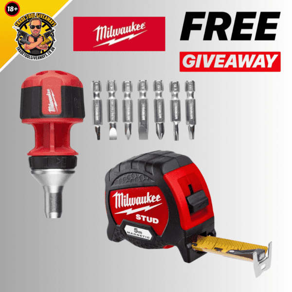 Free – Milwaukee 8 in 1 Screwdriver & 5m Tape Measure